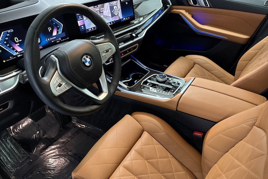This 2024 BMW X7 xDrive40i is a One Owner vehicle with a Clean Carfax, exterior, and interior. Key features include FINELINE STRIPE BROWN HIGH GLOSS WOOD TRIM, PARKING ASSISTANCE PACKAGE, COGNAC SENSAFIN UPHOLSTERY, Turbocharged, Dual Moonroof, Remote Engine Start, Heads-Up Display, Immobilizer, Blind Spot Monitor, Cross-Traffic Alert, Lane Departure Warning, Front Collision Mitigation, and much more!